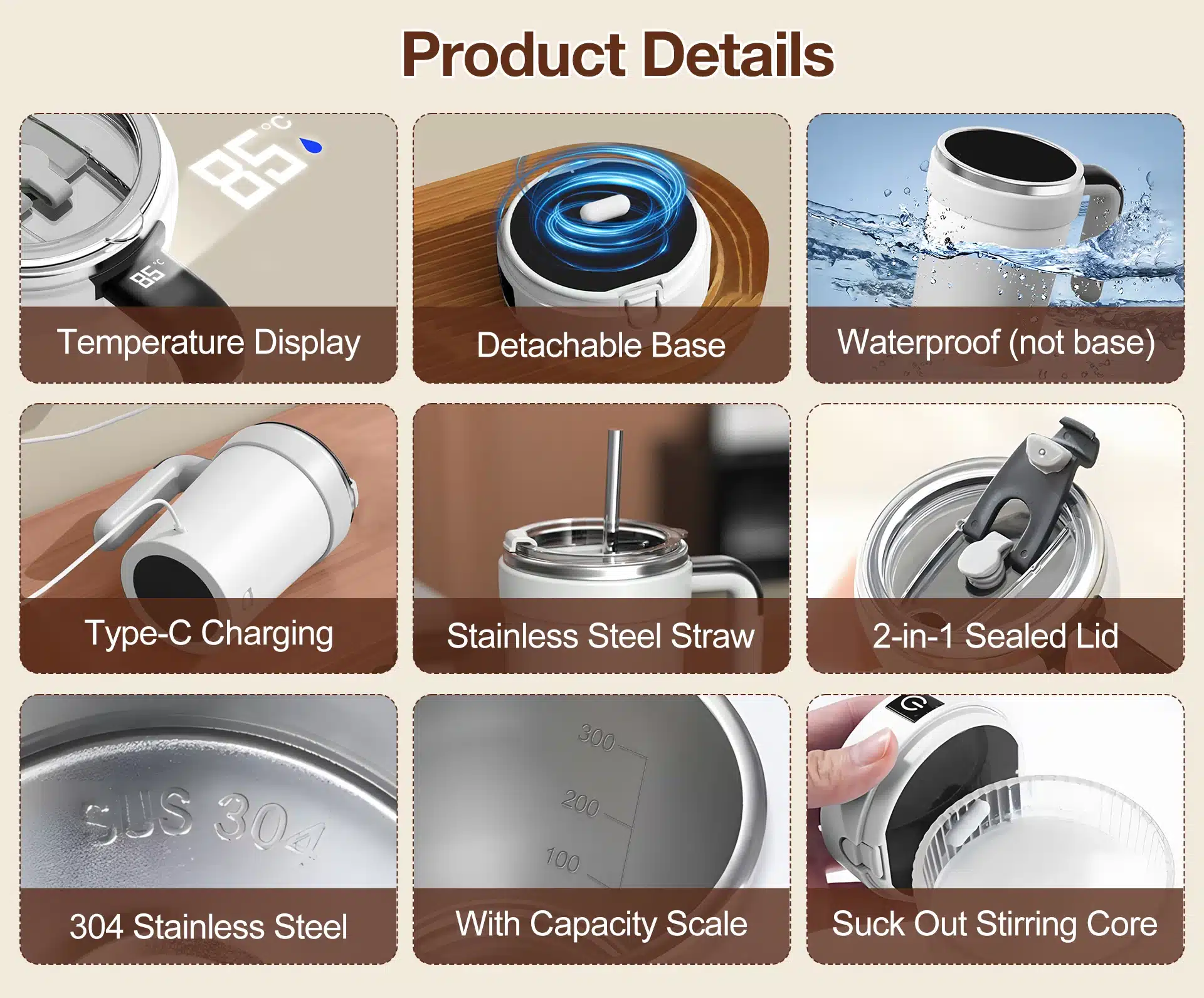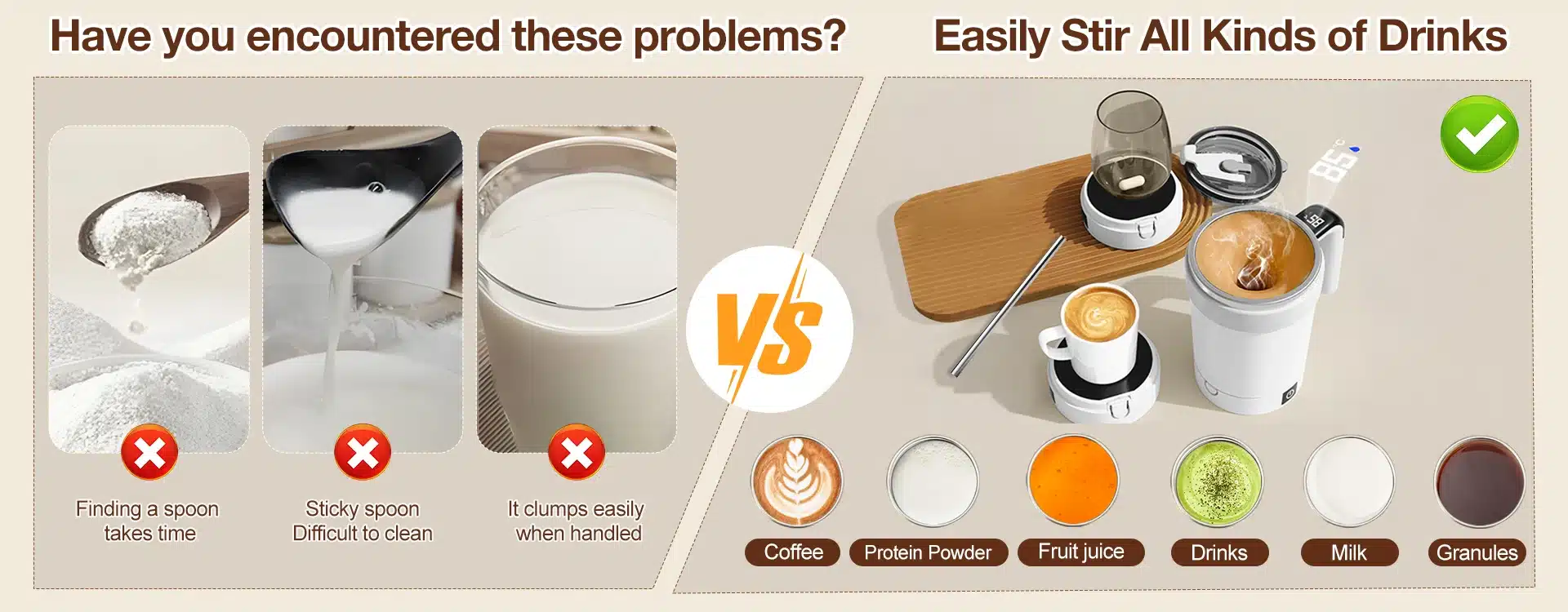 This cup and base can be separated, and the base is suitable for various flat bottomed cups. Other cups can also achieve automatic mixing function, bidding farewell to manual mixing. The base can suck out the mixing core to prevent accidental ingestion.